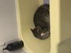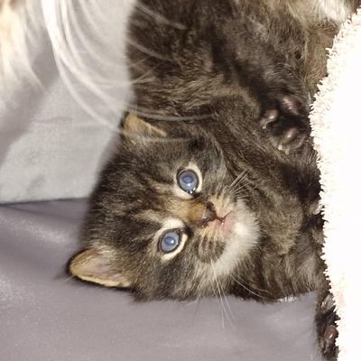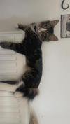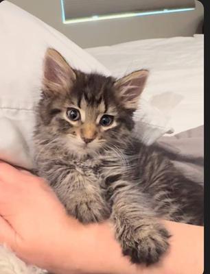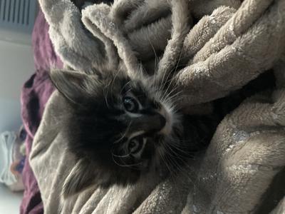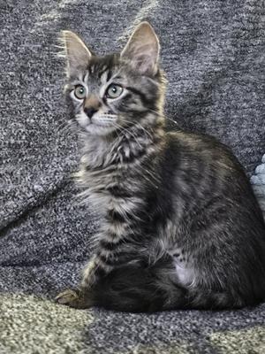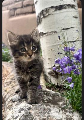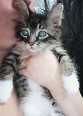 Kitten in question is a black tabby possible Maine Coon mix. This kitten is almost 4 weeks old, weighs 415g, larger than the other kittens.