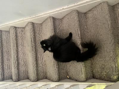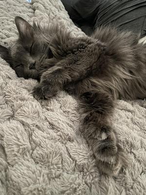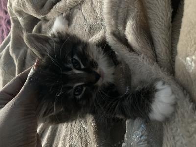 His paws are big and fur growing out of them as well and his tails so big and fluffy! I am not sure what breed he is but I know I’m so thankful we found each other and it’s just me and him.