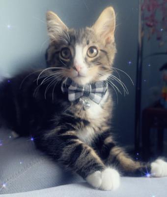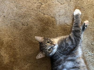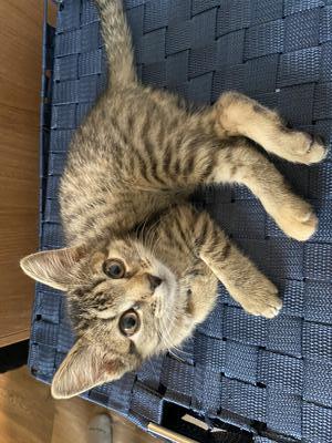 I fostered two 6 week old kittens that were brought in together and found on someone’s porch. Cinnamon, the tortie, likes to play fetch and has an abundance of energy.