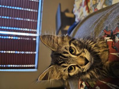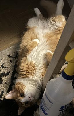 She’s an orange female and mom was a calico. We don’t know who dad is so thinking she’s half coon or Norwegian forest. She has a very loud purr and is SO mischievous and curious