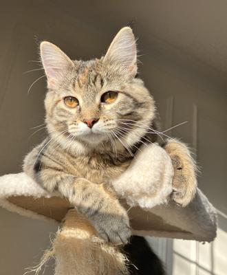She is very curious and follows me around the house. She and her tabby sister, FeeFee are shy with strangers. FeeFee is not as energetic as Cinnamon but still very playful.