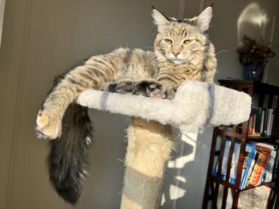 My daughter came over and she used to own a Maine coon. Another neighbor owns a Maine coon, and they both said oh look at the hair and his ears and the little hair on top and look at all the hair between his toes.