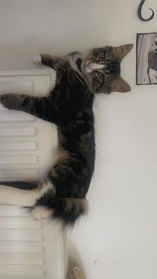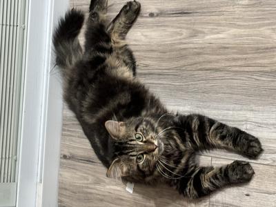 He is still a kitten if I have to guess about 4 months old. He loves to play/hunt.