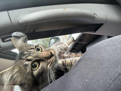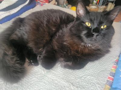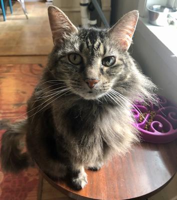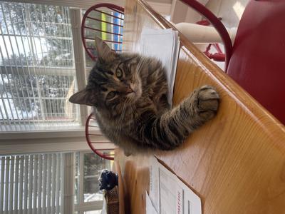 Social. Likes to talk. Walks anywhere we walk. Tuffs on ears. Mane like hair on head. Shelter cat and maybe underweight they said. Very affectionate.