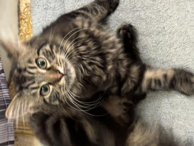 He’s a rescue about 6 months old. He seems very big more his age and has a dog like personality and makes a chirpy noise. He also has tufts of hair growing under his paws. Maine Coon?