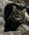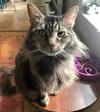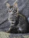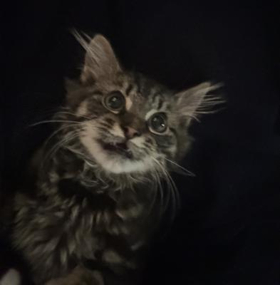 Her paws are huge for her size. She has the lions mane or ruff around her neck. Her eye shape is similar to that of a Maine Coon and she has the beginning meow sound of them.