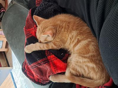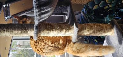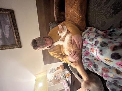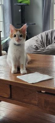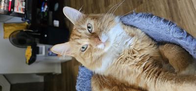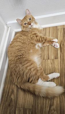 We adopted 9 year old boy, Jean, less than a week ago. He follows us everywhere, and is very affectionate. He’s a big cat, has a fluffy belly and beautiful bushy tail.