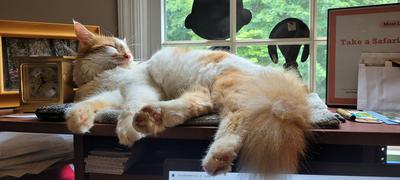 I adopted him a few months ago and I was told he was a Maine coon/Domestic longhair mix. His tail is very long and poofy but the fur on his body isn’t poofy just long. I would like some feedback on what you guys think.