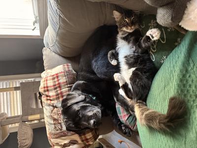He also loves to play in the water, and will sit in the shower playing in the drain. He follows me from room to room and is obsessed with my black lab.